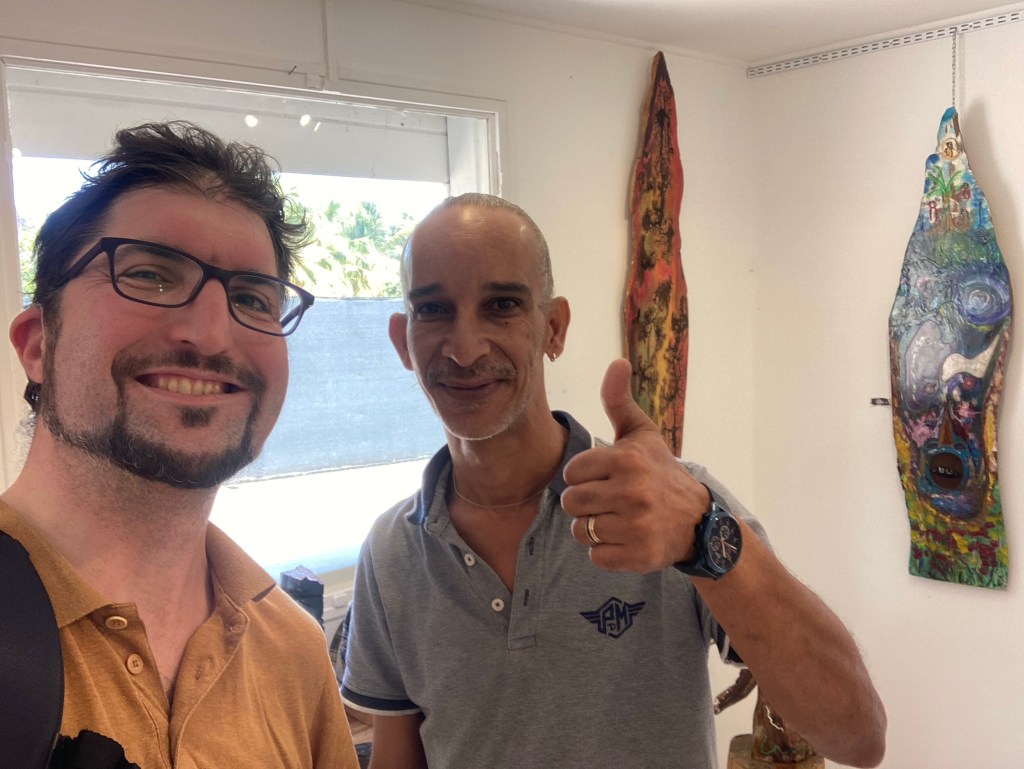 Après le jardin, je voulais pointer mon nez vers la galerie d’exposition qui était juste au dessus. Je me suis laissé embarqué par un artiste talentueux, et qui m’a gentiment offert une canette de mojito light.