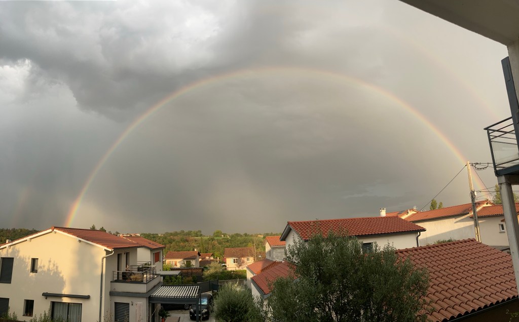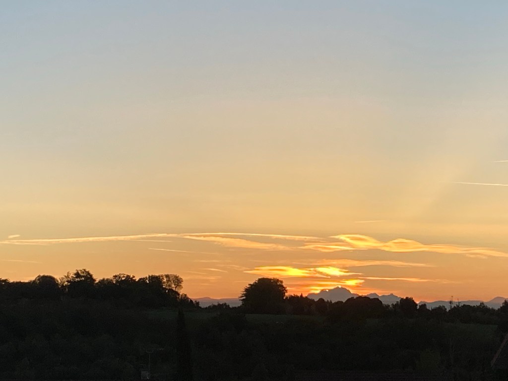 13h30, fin du resto et visite du bureau d’Hervé, je me remis en route en vélo et me baladais sur les routes de campagne. Cela m’avait fait un bien fou. Je me suis mis à contempler les vergers, les monts du lyonnais et au loin, le massif du Pilat.